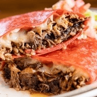 Hickory Smoked Brisket in a Tomato Tortilla filled with Black Beans, Spanish rice and Monterey Jack cheese. Salsa bambino and sour cream or tofu sour cream on the side