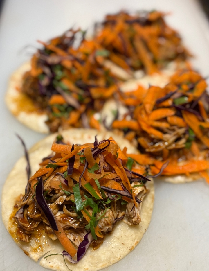 4 Soft Corn Tortillas w/Grilled Chicken Topped with Tinga's Mole Sauce & Topped with Shredded Cabbage in 4" soft corn tortillas