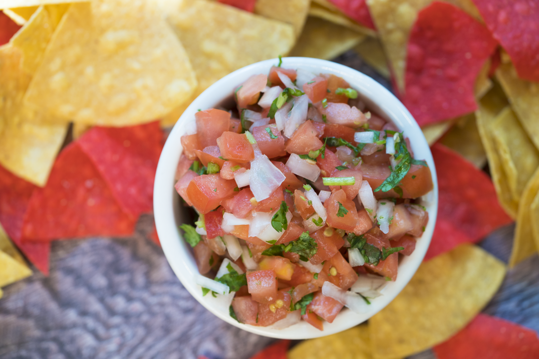 Grilled Tofu, Sliced Avocado, Portobello Mushrooms & Tofu “sour cream” in a Tomato Tortilla, Salsa Bambino & chips on the side.