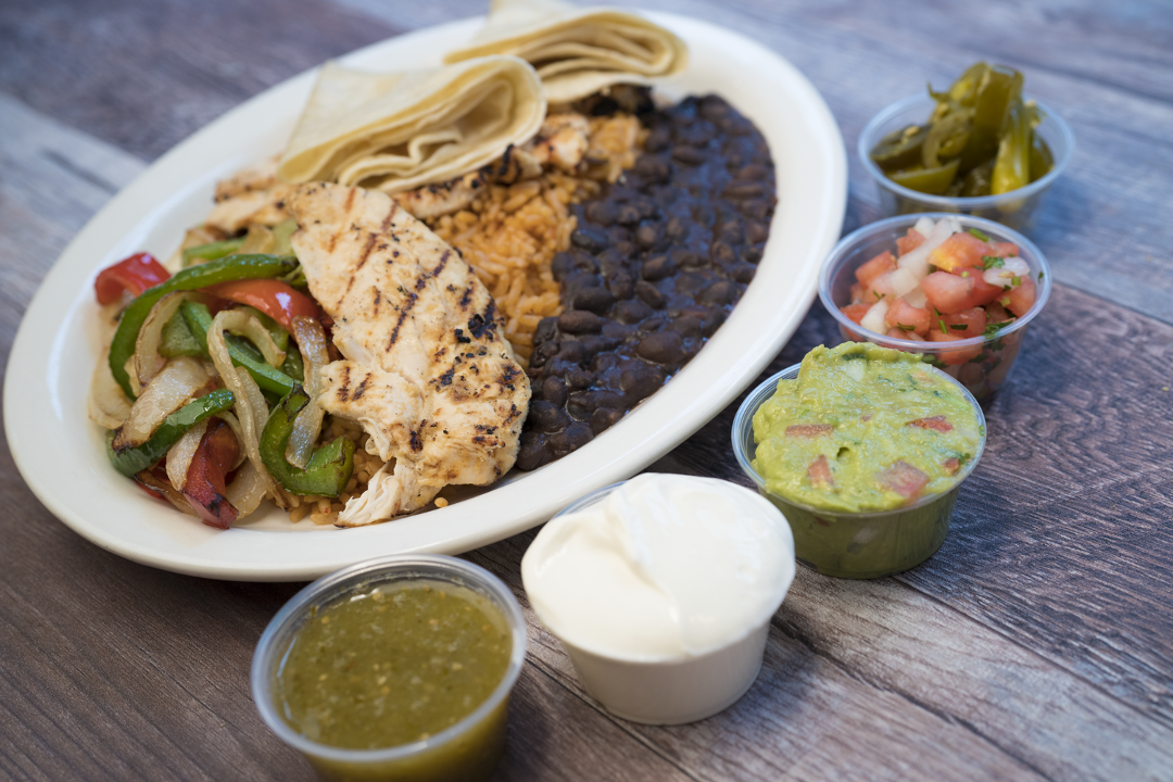 Flour tortillas Tender Grilled Chicken, Sauteed Peppers & Onions, Lettuce, Pico de Gallo, Tomatillo Sauce, Jalapenos, Onions, Sour Cream and Guac along with Spanish Rice, Black Beans. Everything comes separately so it doesn't get soggy!