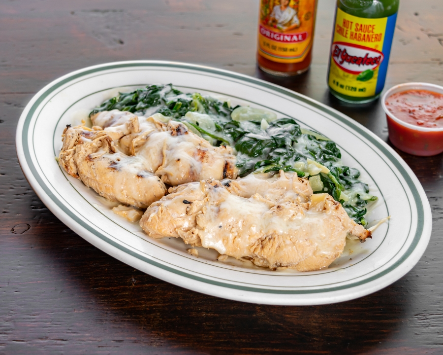 Tender Grilled Chicken, Spinach Sauteed with Onions & garlic and Topped with melted Monterey Jack Cheese