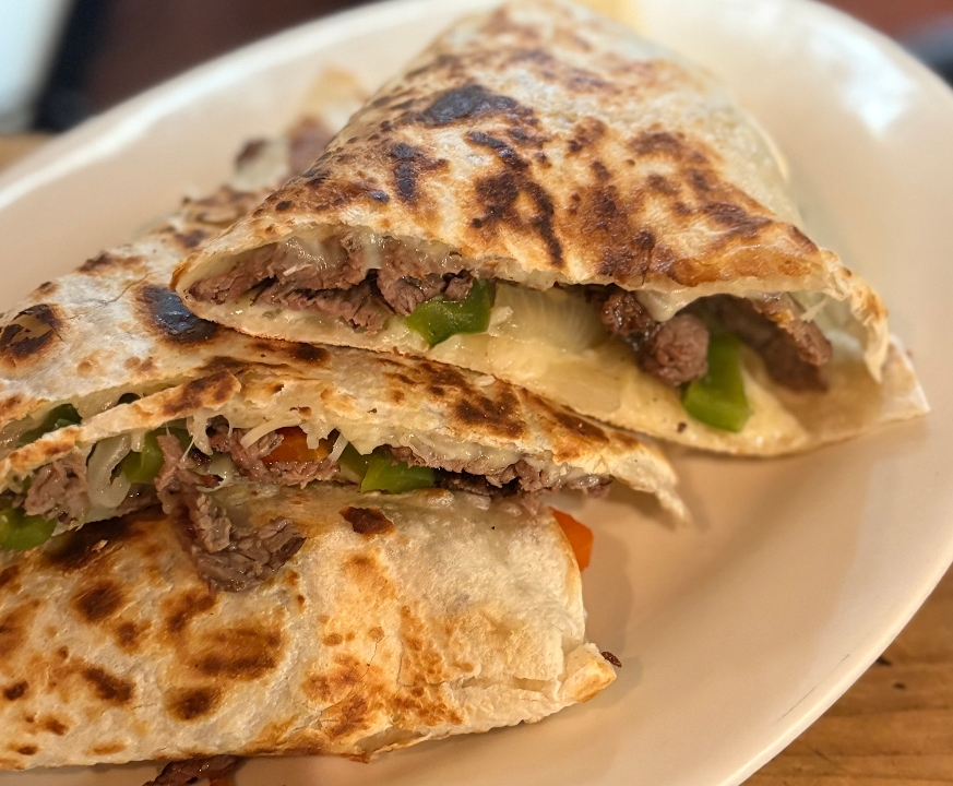 Char-grilled steak with Monterey Jack cheese, peppers and onions in a flour tortilla. Chips & salsa on the side.