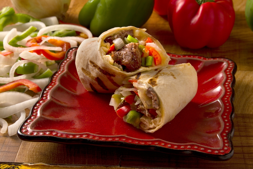 Flour tortillas Tender Grilled Steak, Sauteed Peppers & Onions, Lettuce, Pico de Gallo, Tomatillo Sauce, Jalapenos, Onions, Sour Cream and Guac along with Spanish Rice, Black Beans. Everything comes separately so it doesn't get soggy!