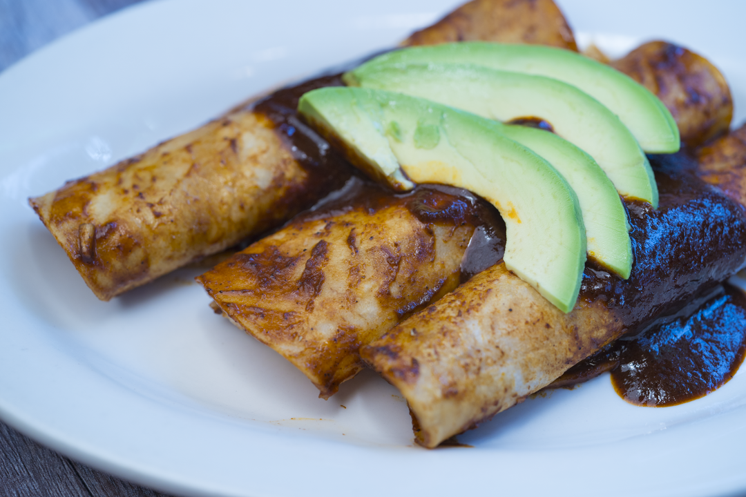 3 soft corn tortilla filled with Chicken and rolled in our house made mole sauce served with lettuce, fresh sliced avocado, onions, tomato and Spanish rice on the side.