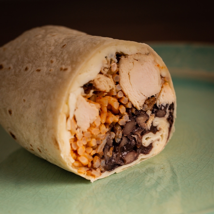 Tender Grilled Chicken in a Flour Tortilla filled with Black Beans, Spanish rice and Monterey Jack cheese. Salsa bambino and sour cream or tofu sour cream on the side