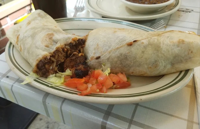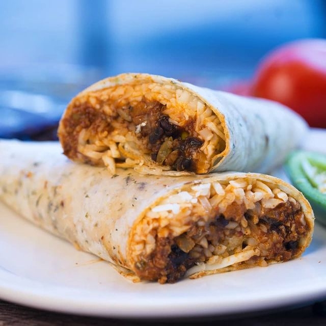 Flour tortillas Beyond Meat, Sauteed Peppers & Onions, Lettuce, Pico de Gallo, Tomatillo Sauce, Jalapenos, Onions, Sour Cream and Guac along with Spanish Rice, Black Beans. Everything comes separately so it doesn't get soggy!
