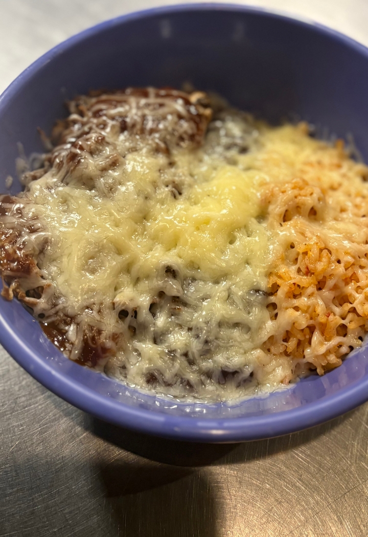 Flour Tortilla filled Black Beans, Spanish rice and Monterey Jack cheese. Salsa bambino and sour cream or tofu sour cream on the side