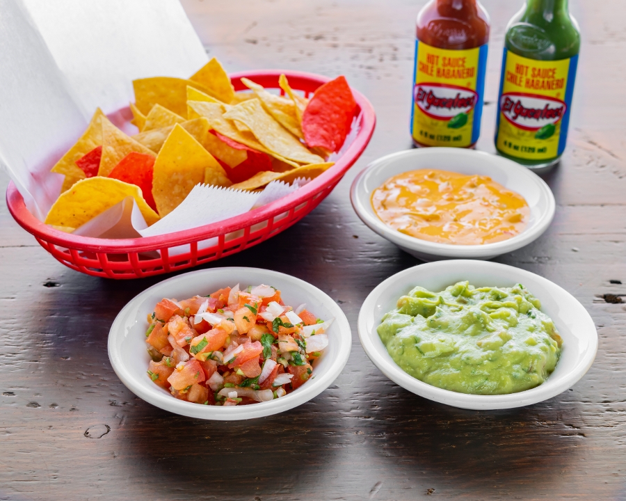 4 oz each Guac, Pico de Gal & Queso with Tinga's Tortilla Chips
