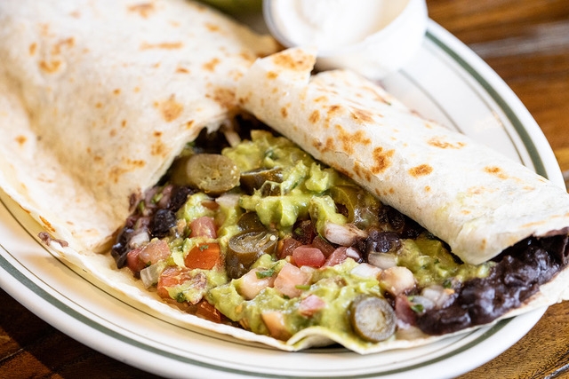 8" Flour Tortilla filled with Home-Made Guacamole, Rice, Beans & Monterey Jack Cheese. Choice of House Salad, Chips or French Fries (+$2) on the Side
