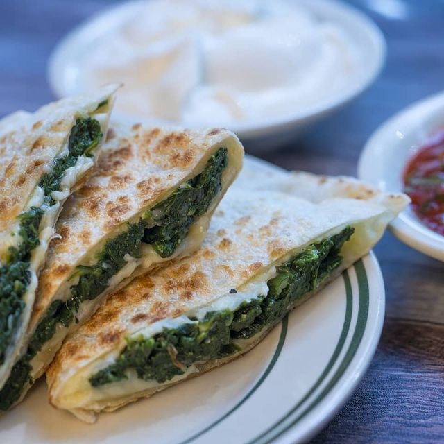 8" Flour Tortilla, pan toasted & filled with Spinach Sauteed with garlic & onkions & Monterey Jack Cheese. Choice of House Salad, Chips or French Fries (+$2) on the Side