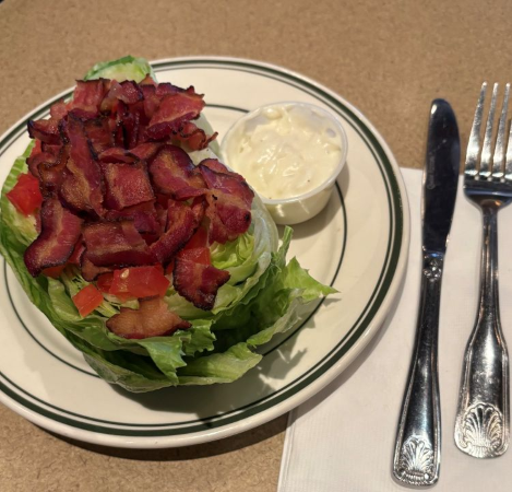 A Wedge of Iceberg lettuce topped with Pico de Gallo & Chopped Bacon. Bleu Cheese dressing on the side