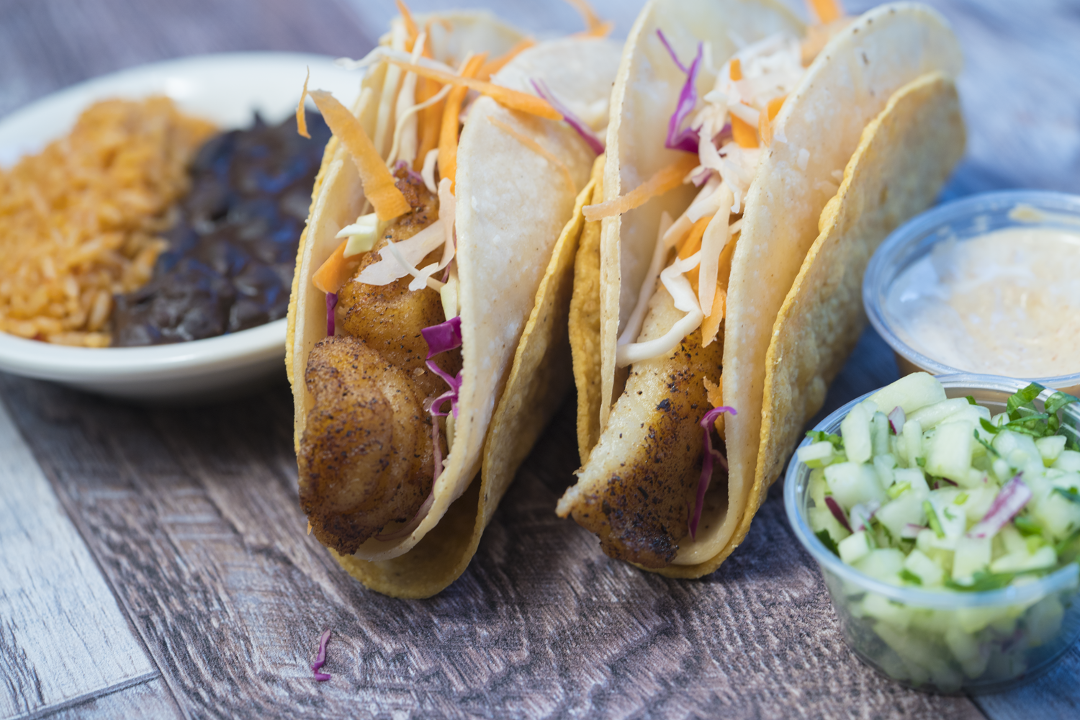 Light Basa Filet with Cajun Seasoning in a Flour Tortilla filled with Black Beans, Spanish rice and Monterey Jack cheese. Salsa bambino and sour cream or tofu sour cream on the side