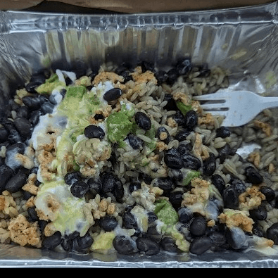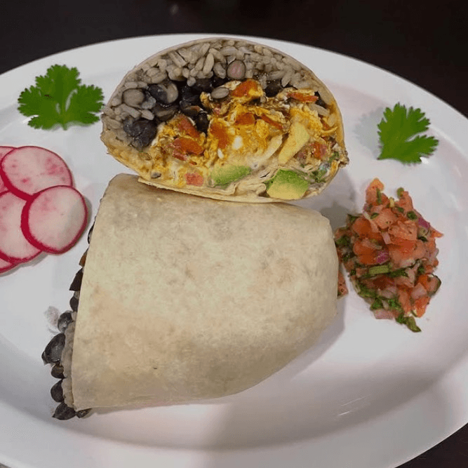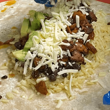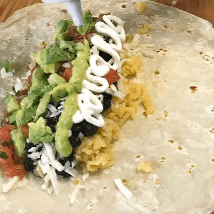 Rice, beans, grilled zucchini, bell peppers, onions, avocado, pico de gallo, Jack cheese, sour cream & guajillo sauce