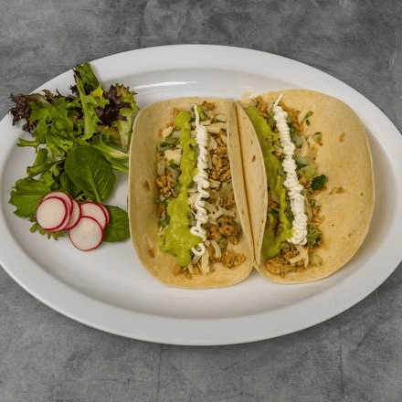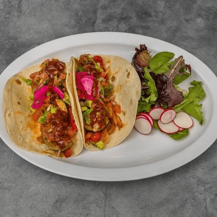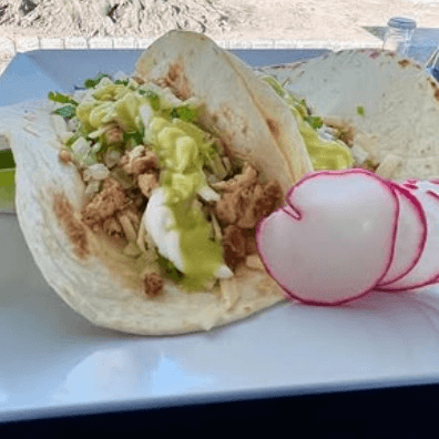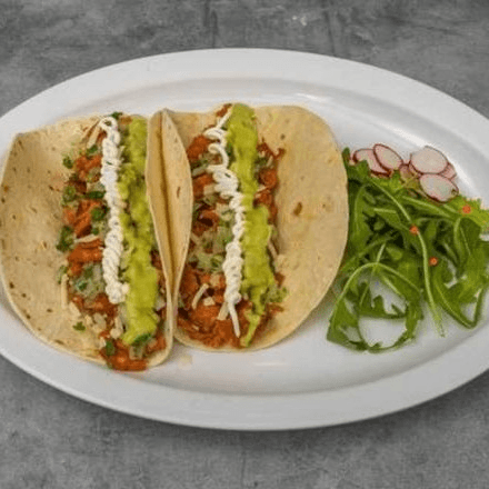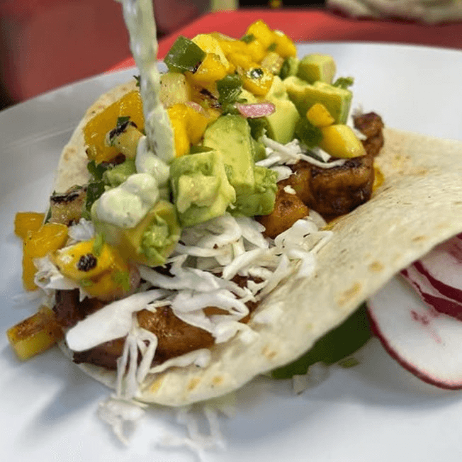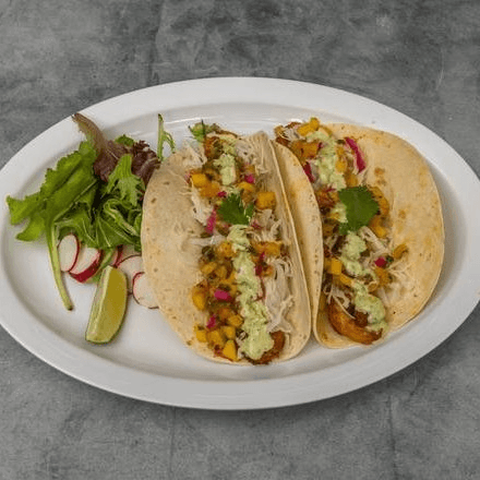 (2). Shrimp, cabbage, avocado, pineapple mango salsa, cilantro & crema lime sauce