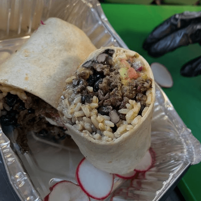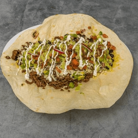 Ground beef, rice, beans, avocado, pico de gallo, sour cream, Jack cheese, & green tomatillo sauce