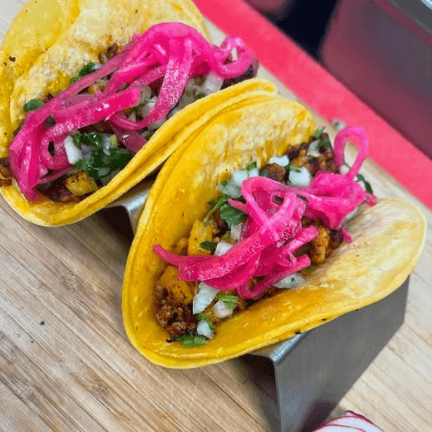 (2). Pickled onions, raw onions, cilantro & green tomatillo sauce