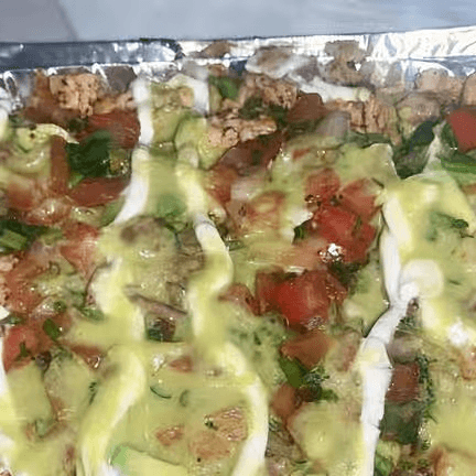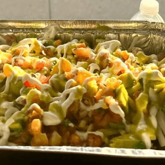 Chicken, nacho cheese sauce, beans, avocado, pico de gallo, shredded cheese & sour cream