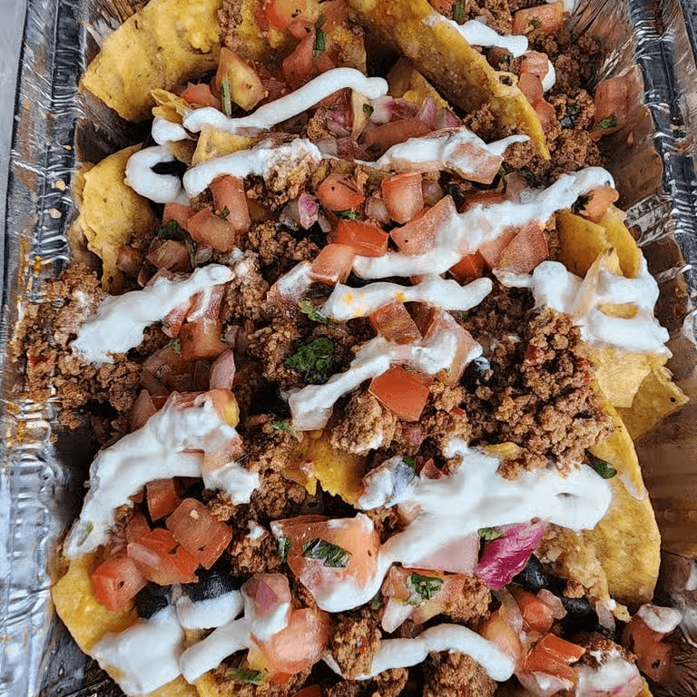 Ground beef, nacho cheese sauce, beans, avocado, pico de gallo, shredded cheese & sour cream